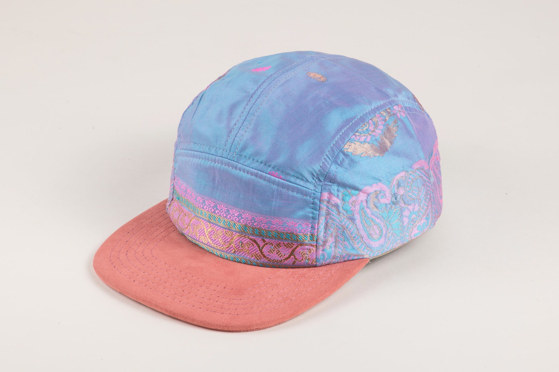 The sari this hat is made from was gifted to us by a dear family friend who exudes warmth, generosity, and confidence. The baby blue base is accentuated by intricate pink woven detailing in the front two panels. The contrast and joyful tones create a very unique piece. Sport this hat in the sun and you will see the color shift as the rays strike it in different places.