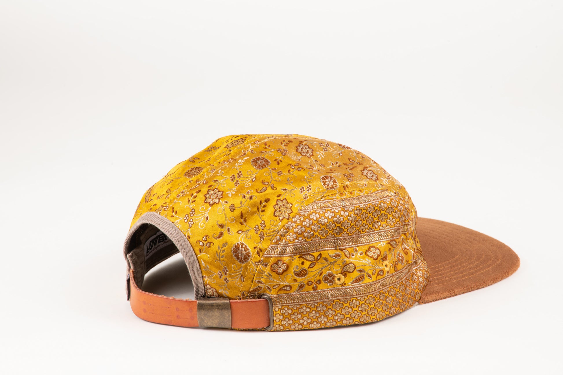 This hat is upcycled from an Indian sari—a woven fabric traditionally worn by women as a symbol of femininity, dignity, and grace.